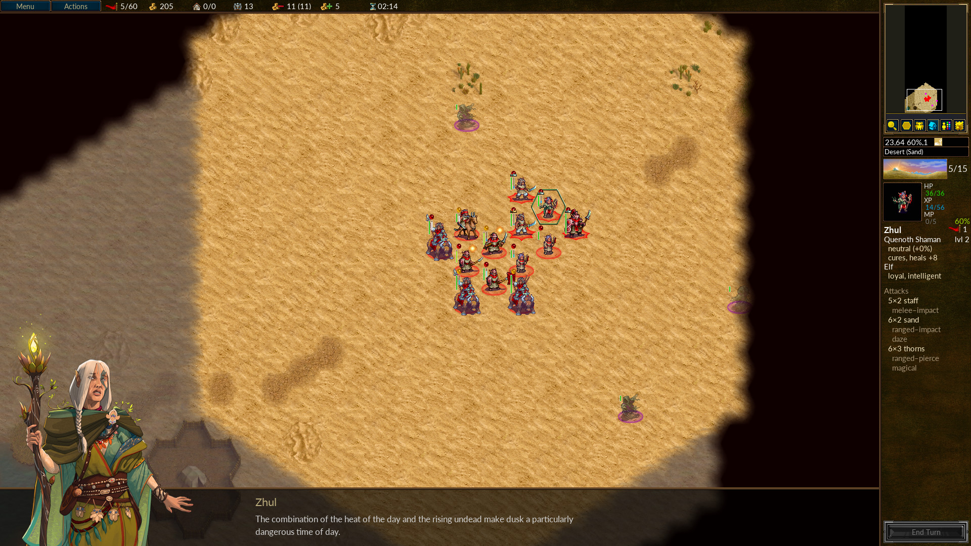 Tras años de contratiempos técnicos, Bajo los soles ardientes ve finalmente a la facción de los elfos del desierto completamente rediseñada con animaciones totalmente nuevas, nuevos retratos impresionantes del durante mucho tiempo colaborador artístico Emilien Rotival (LordBob), y árboles de promoción para las unidades rediseñados con estadísticas únicas para mantenerlas aún más diferenciadas de los elfos del bosque comunes de los que disponemos en el resto del juego.