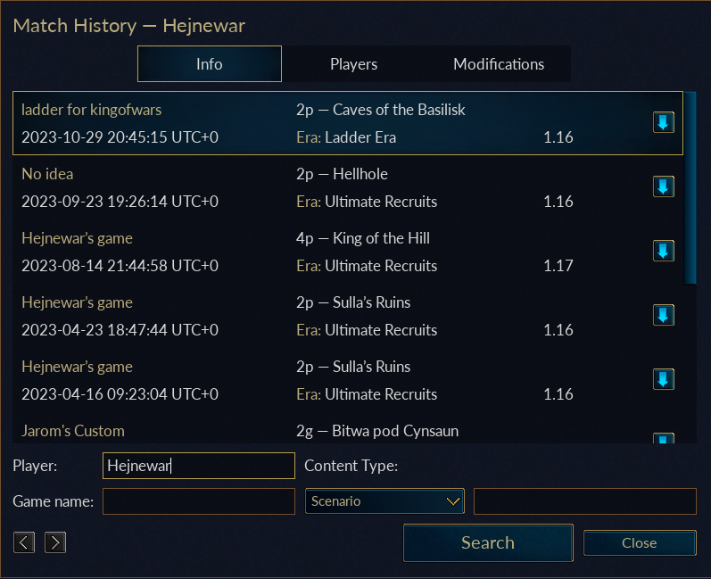 Players can now view a history of their own previously played games and can search the history of other players as well by clicking the Match History button in the on-line multiplayer lobby. This shows information on the game itself, the players in the game, the era used, any modifications enabled, and lets you download the game’s replay to watch for yourself. Additionally, there’s an on-line dashboard available with more general data about games played.