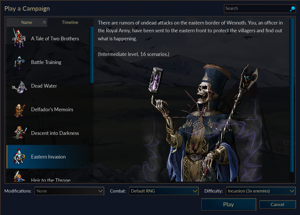 Eastern Invasion — the first Loyalist campaign ever added to Wesnoth — has been fully remade with far deeper characters and greater scenario variety augmented by much more dynamic AI opponents. Several lore conflicts with other campaigns have also been resolved.